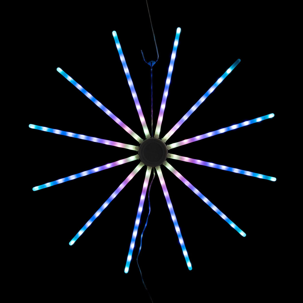 Add festive flair to your space with the App Controlled LED Lightshow Spinner. This 60cm starburst display features stunning RGB lighting effects and adjustable colors, perfect for creating a magical holiday atmosphere indoors or outdoors.