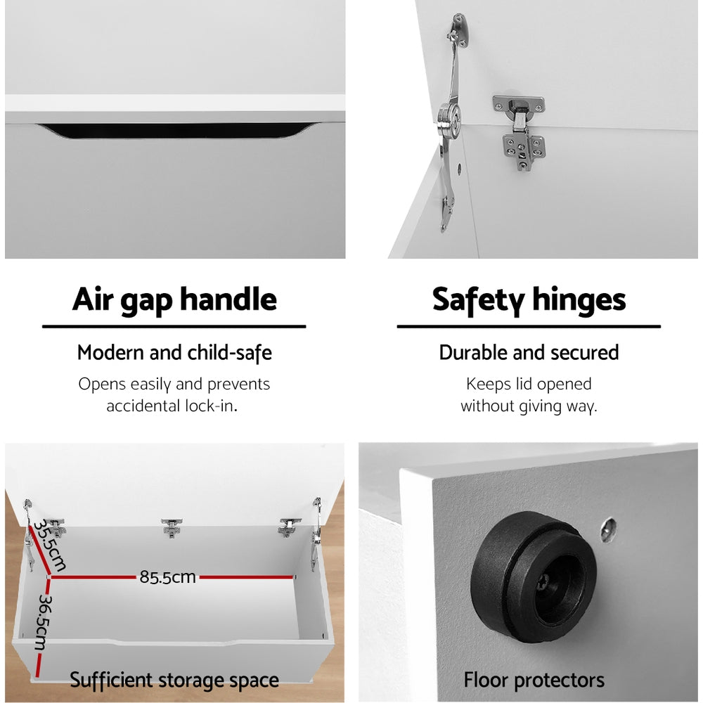 Made of sturdy 15mm particle board, the box measures 92cm long and 40cm wide with a depth of 40cm. It is compact and deep enough to store all of his or her favourite play things without fuss. With a white paper finish, the child-safe box also features a thoughtful air gap between the lid and box for finger protection. Not least, the box also comes with floor protectors to prevent damage and scratches on your pristine floor.