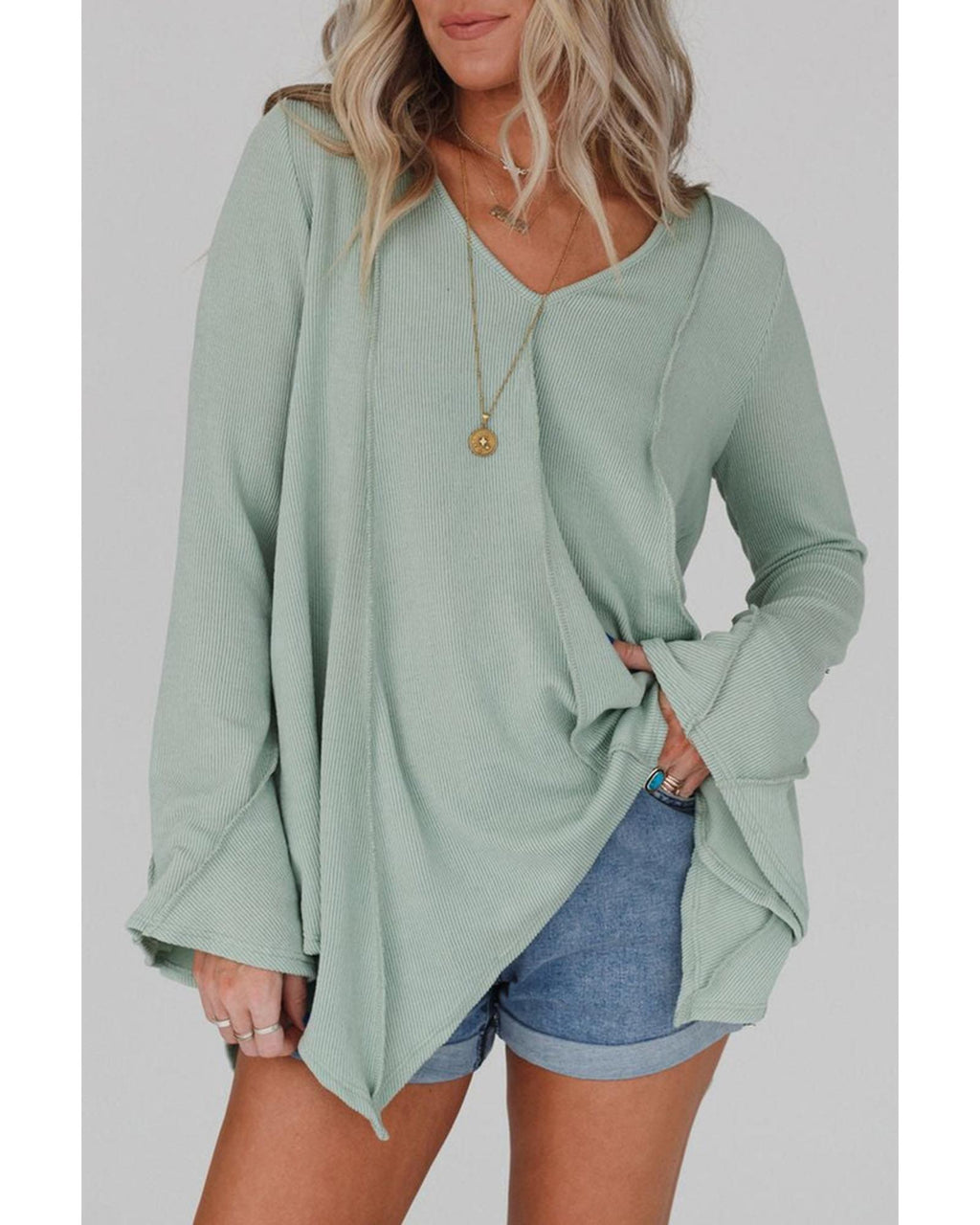 - Ribbed Expose Seam Bell Sleeve Top