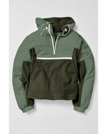 - Green Fleece Patchwork Color Block Zip Funnel Neck Sweatshirt