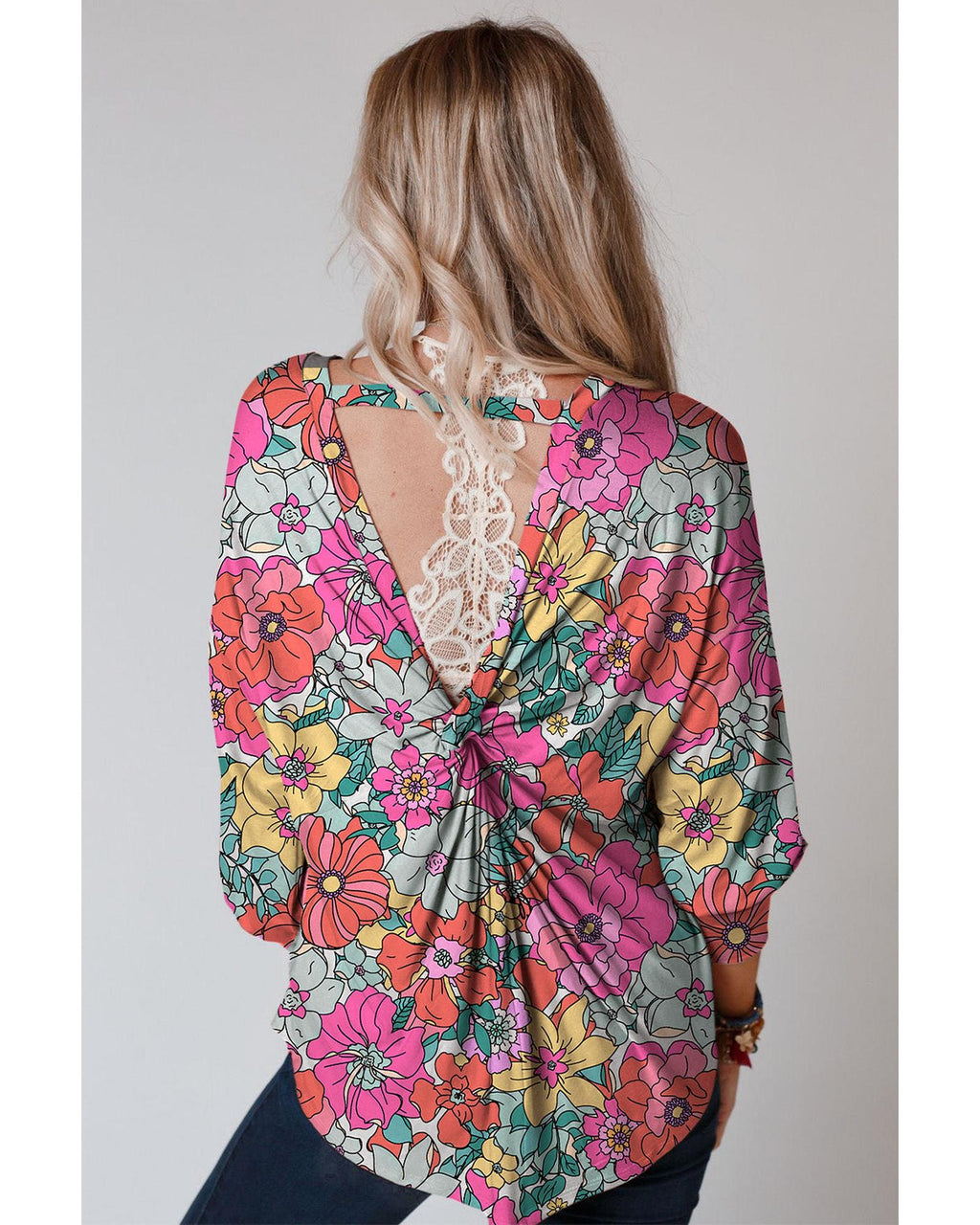 - Multicolor Twisted Hollow-out Back Floral Long Sleeve Top