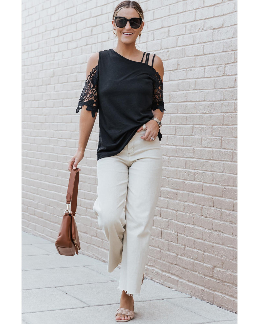 - Stylish and trendy Lace Splicing Strappy Cold Shoulder Top