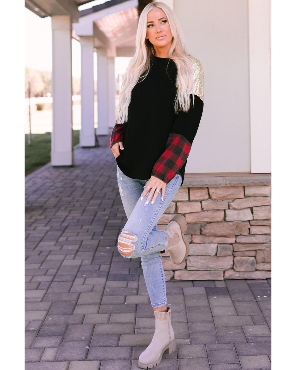 - Stylish and trendy Crewneck Lantern Sleeve Plaid Sequin Splicing Pullover Sweatshirt
