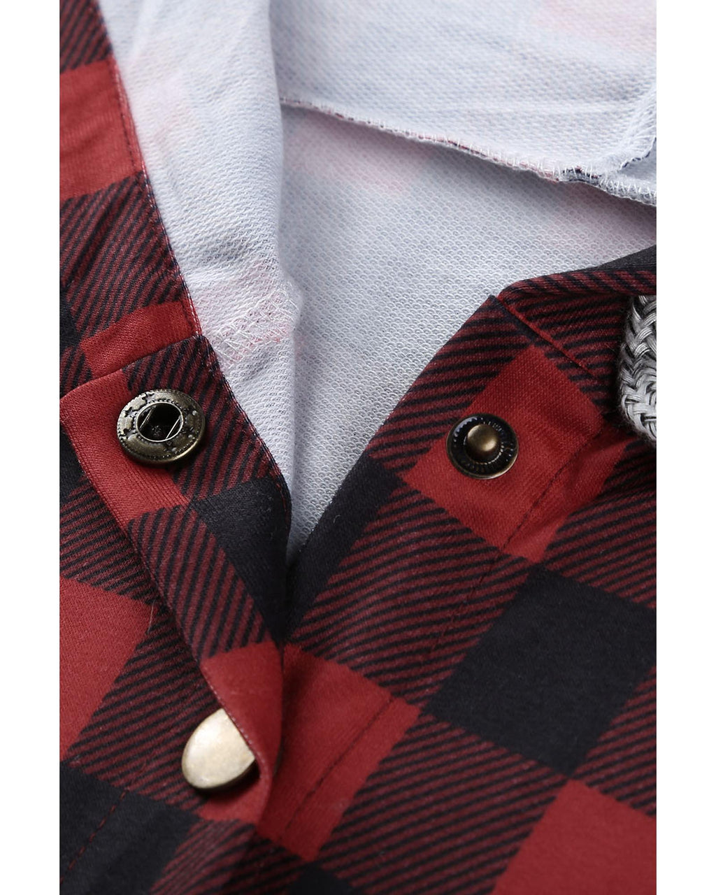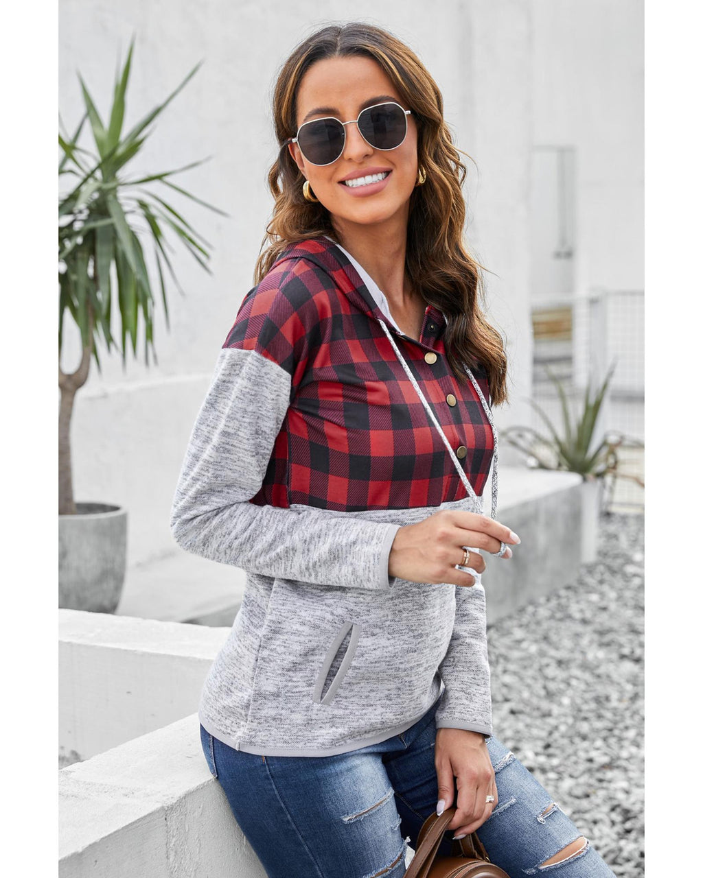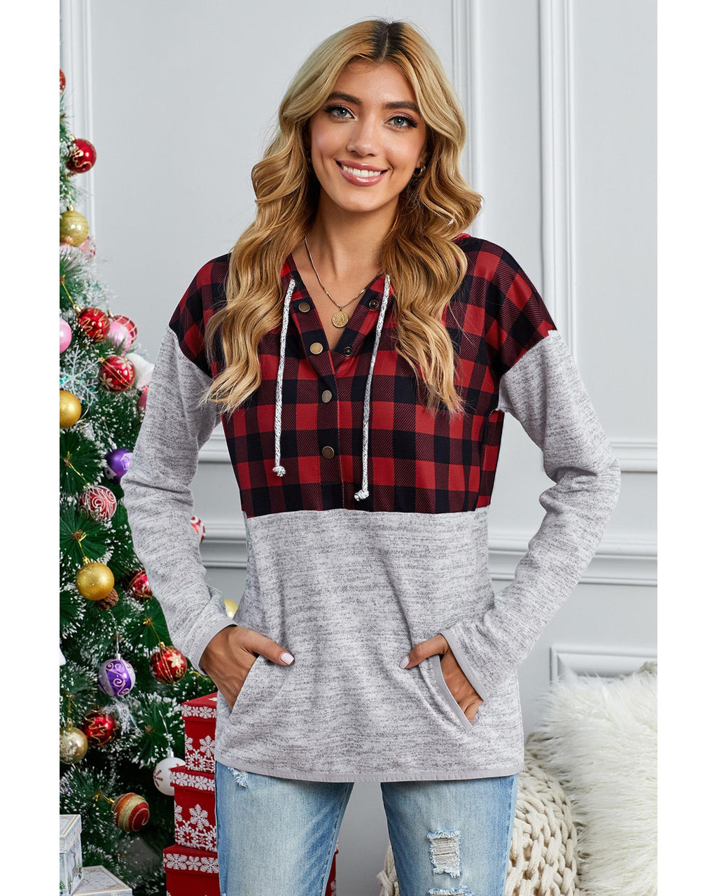 - Plaid Splicing Pocketed Gray Hoodie