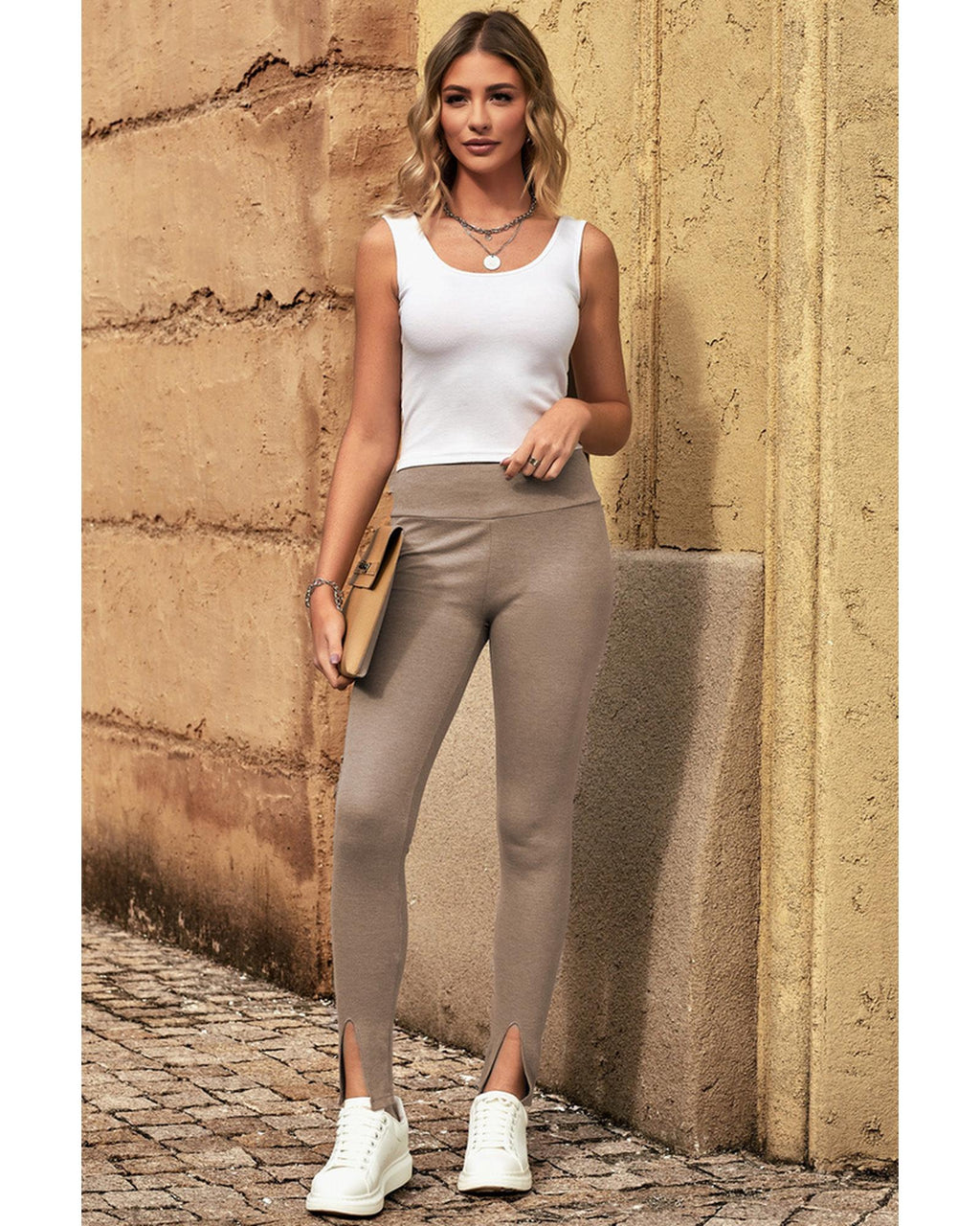 - Khaki Rib Knit High Waist Slit Leggings\n