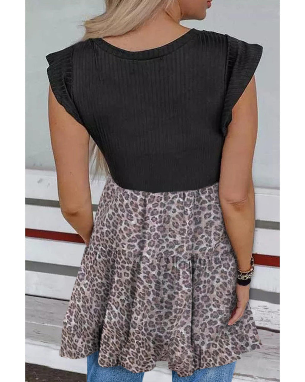 - Stylish and trendy Ruffle Sleeve Bodice Leopard Splice Blouse