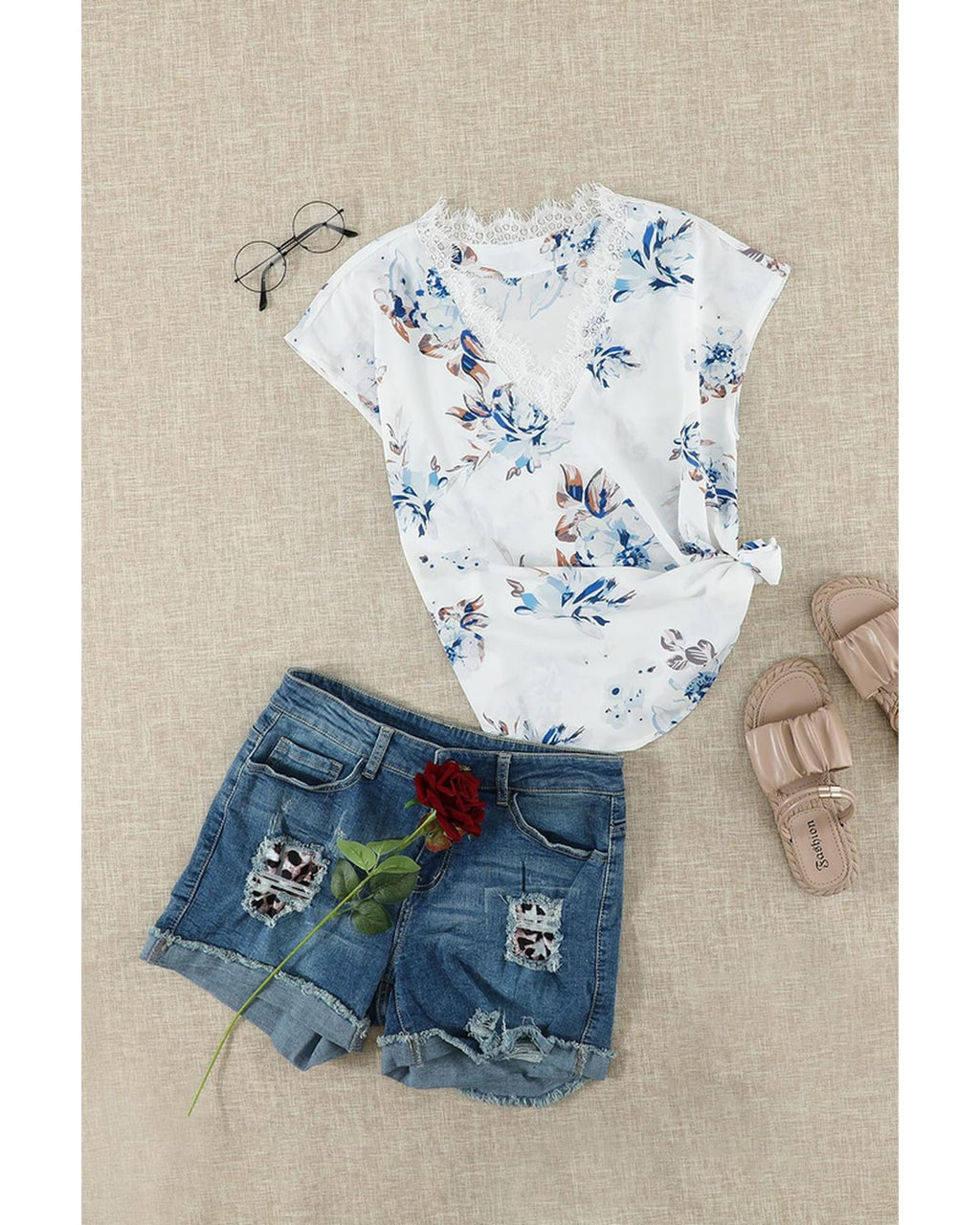 - Floral Scalloped V Neck Short Sleeves Top