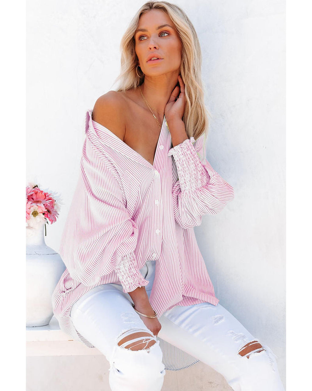 - Versatile and stylish Smocked Cuffed Striped Boyfriend Shirt with Pocket