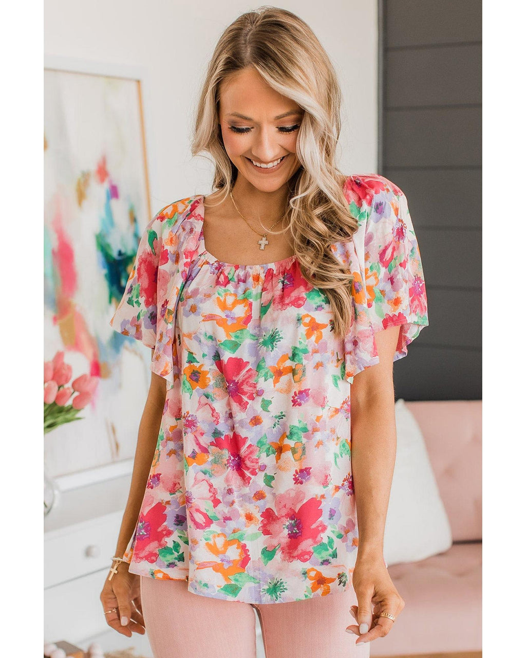 - Multicolor Watercolor Floral Square Neck Ruffle Sleeve Blouse