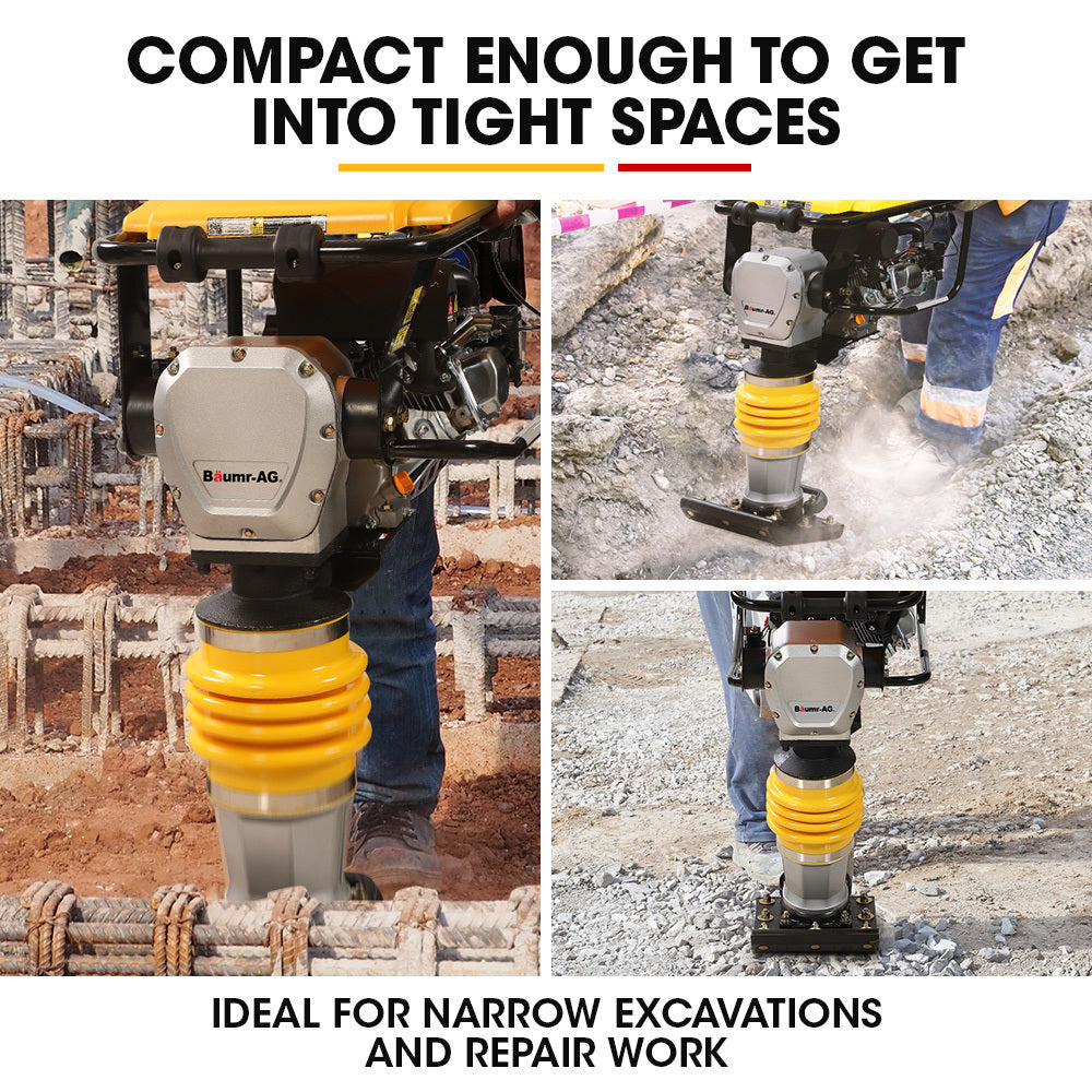 The Baumr-AG BRM-700 is a leap ahead in compact tamping construction equipment. With an impressive impact rate of up to 650 beats per minute, this mighty machine is engineered for excellence. Powered by a robust 4-Stroke, 196cc, OHV engine boasting 6.5hp, the BRM-700 ensures unparalleled performance on the job site.