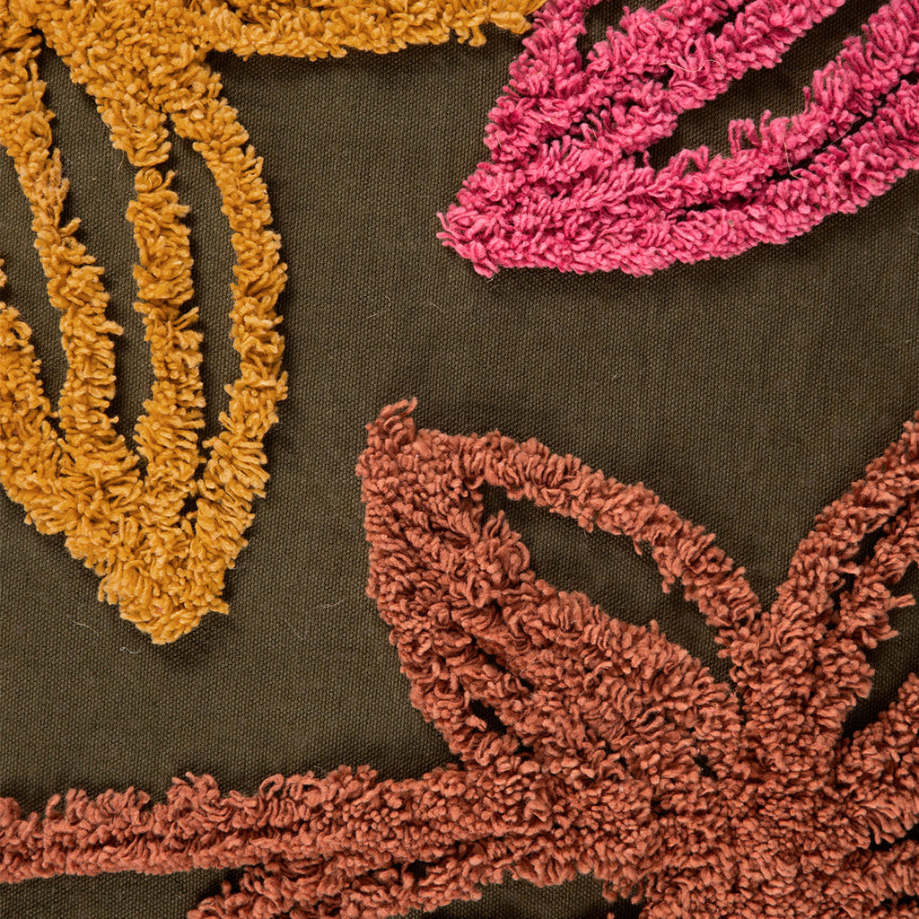 Posy Olive Green is a trendy decorative cushion with a beautiful finish. The cushion has a tufted pattern of flower silhouettes in the colour tones of pink, green, brown, and yellow. The tufted pattern gives this cushion a fun 3D effect and a lovely texture.