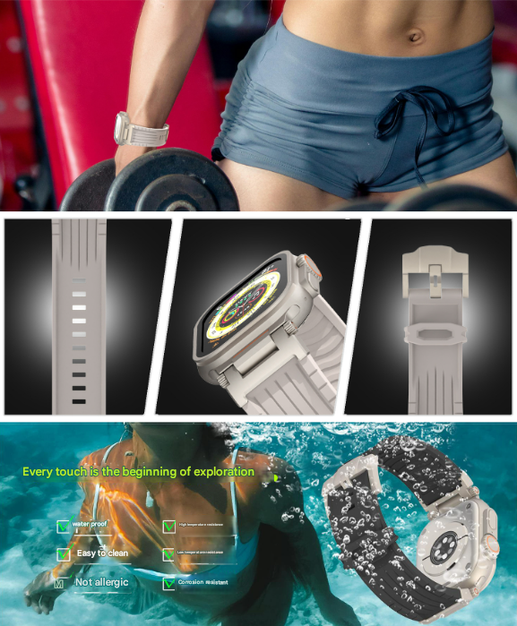 • Premium Materials: Crafted from high-quality, skin-friendly silicone that is soft, flexible, and sweat-resistant. The connectors and buckle are made from durable metal (appears to be stainless steel with a matte finish) for enhanced longevity and a secure fit.