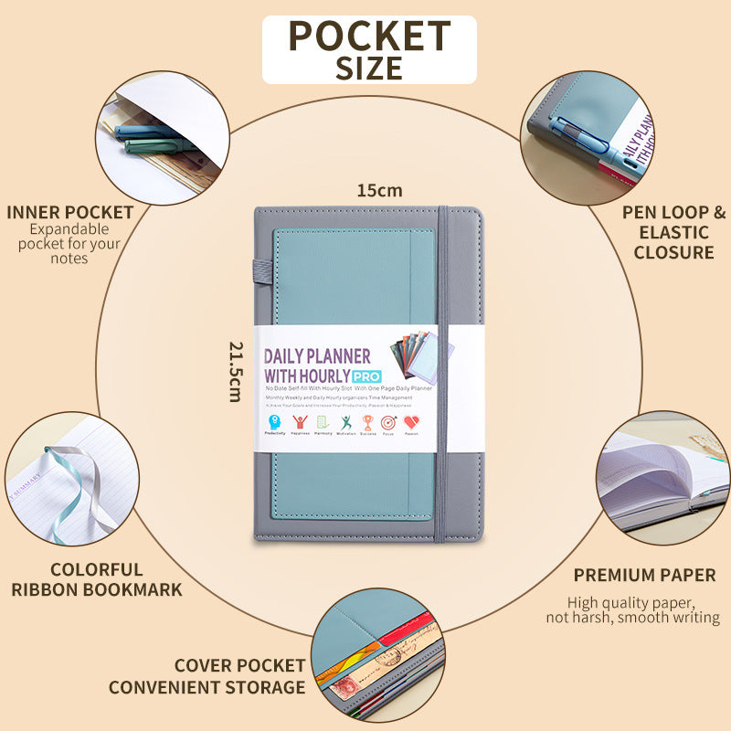 - Premium & Practical Design: The planner features a durable and stylish two-tone PU leather cover with a convenient front pocket for cards or notes. An elastic closure band, a pen loop, dual ribbon bookmarks, and an expandable back pocket add layers of practical functionality.