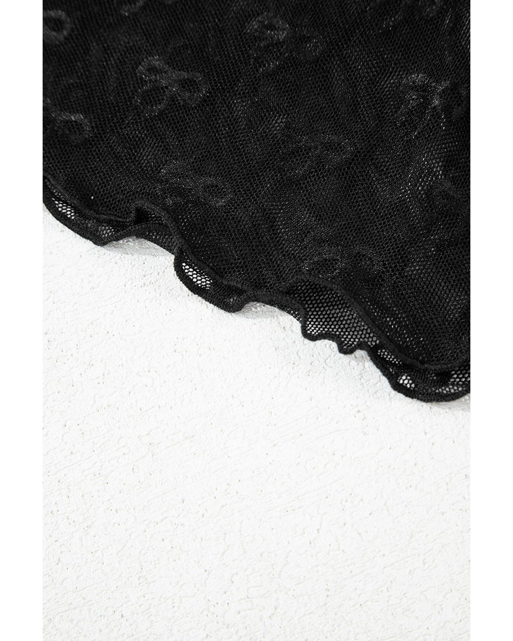 Black Bowknot Sheer Mesh Mock Neck Lettuce Trim Short Sleeve Top - L