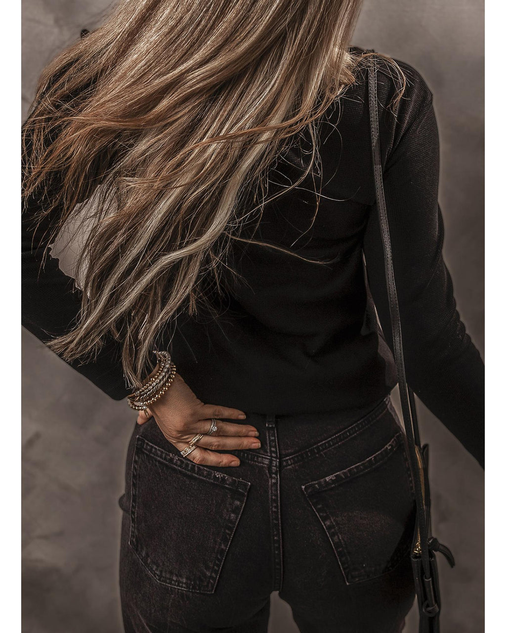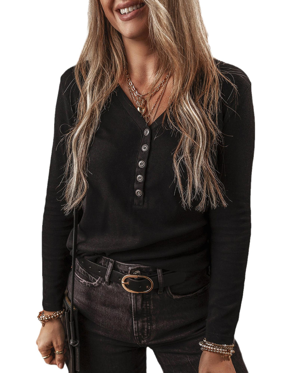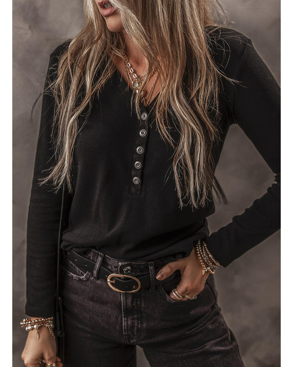 Black Buttoned V Neck Long Sleeve Ribbed Top - XL