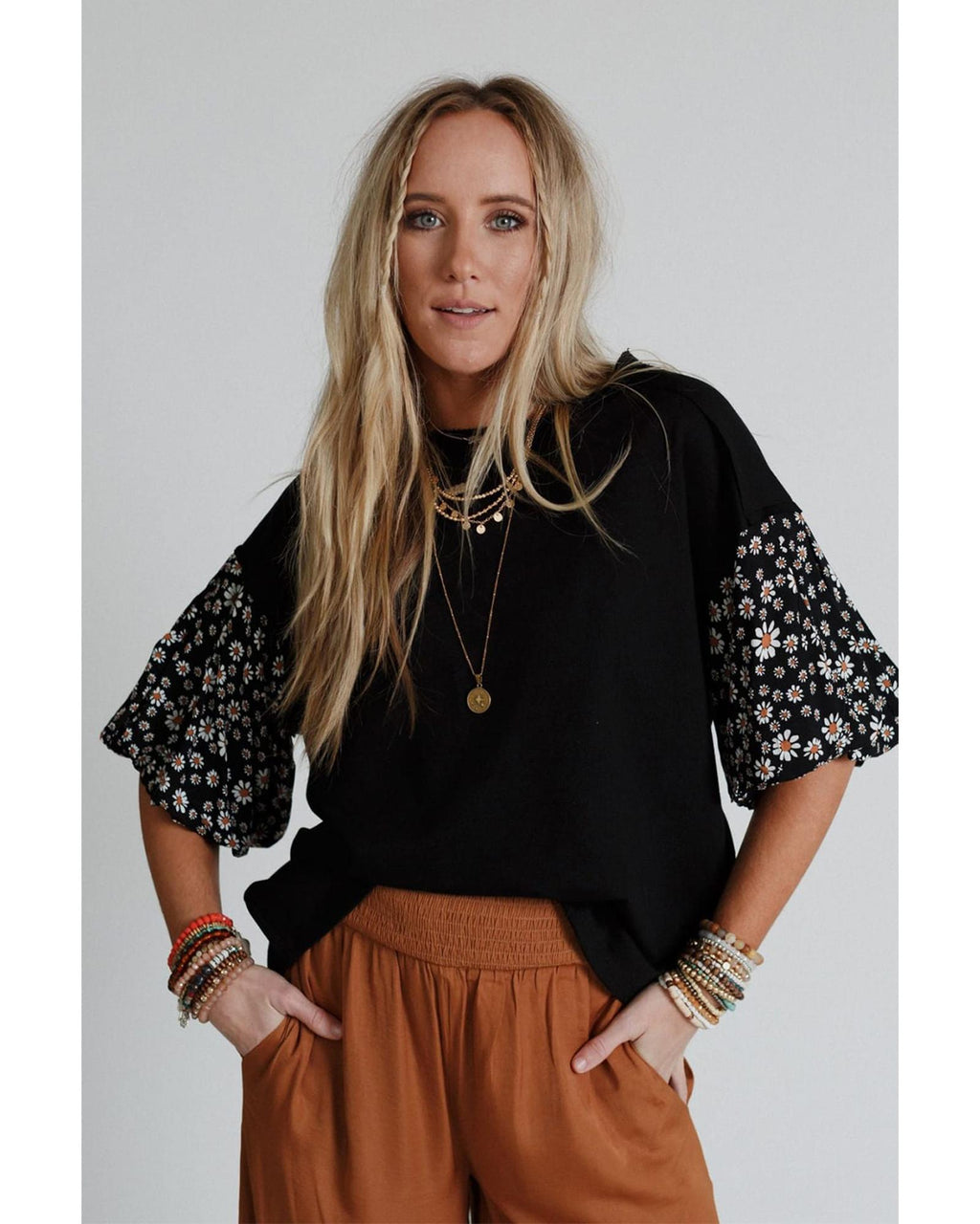 • Black Contrast Floral Puff Sleeve Oversized Top
